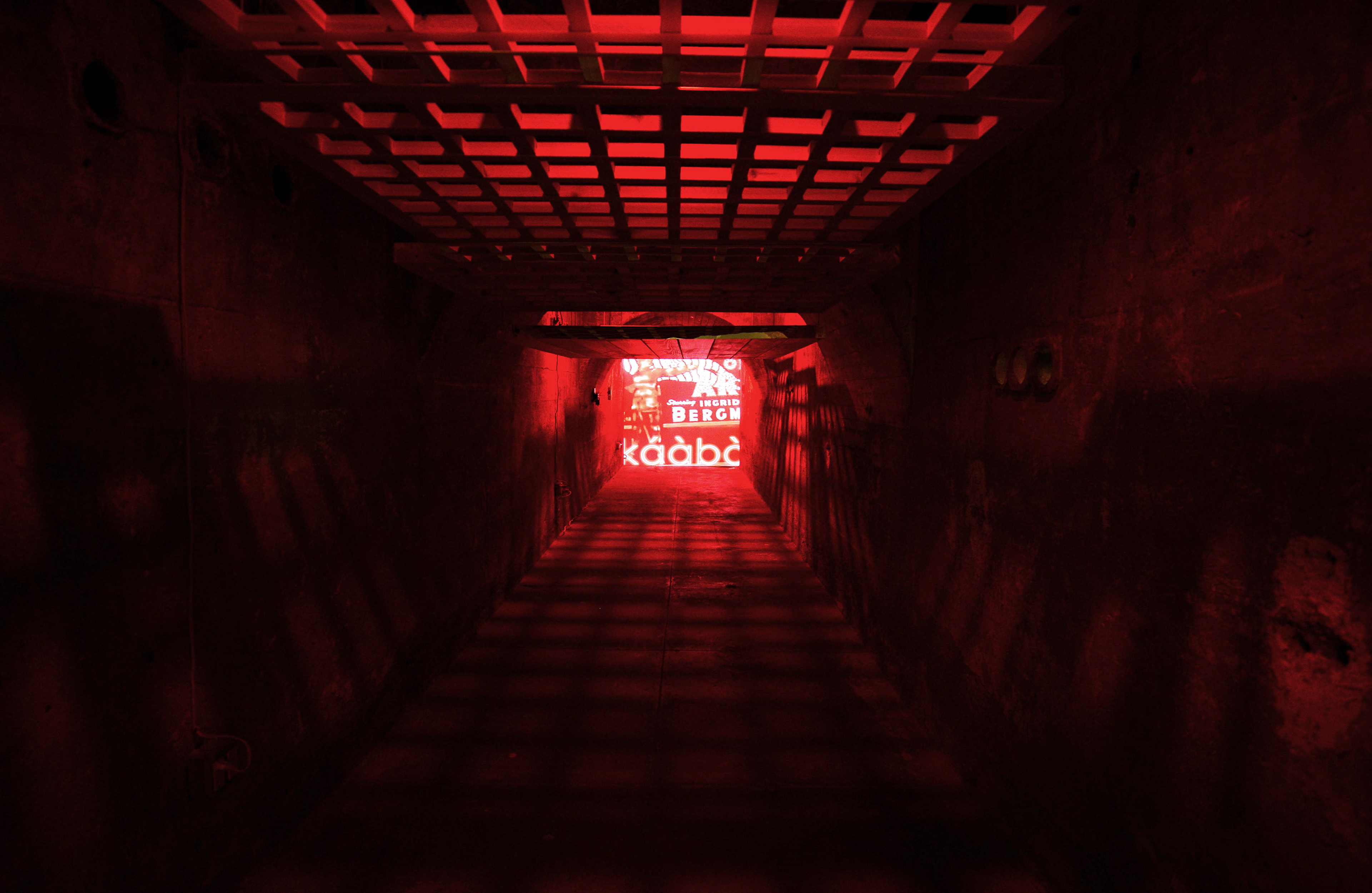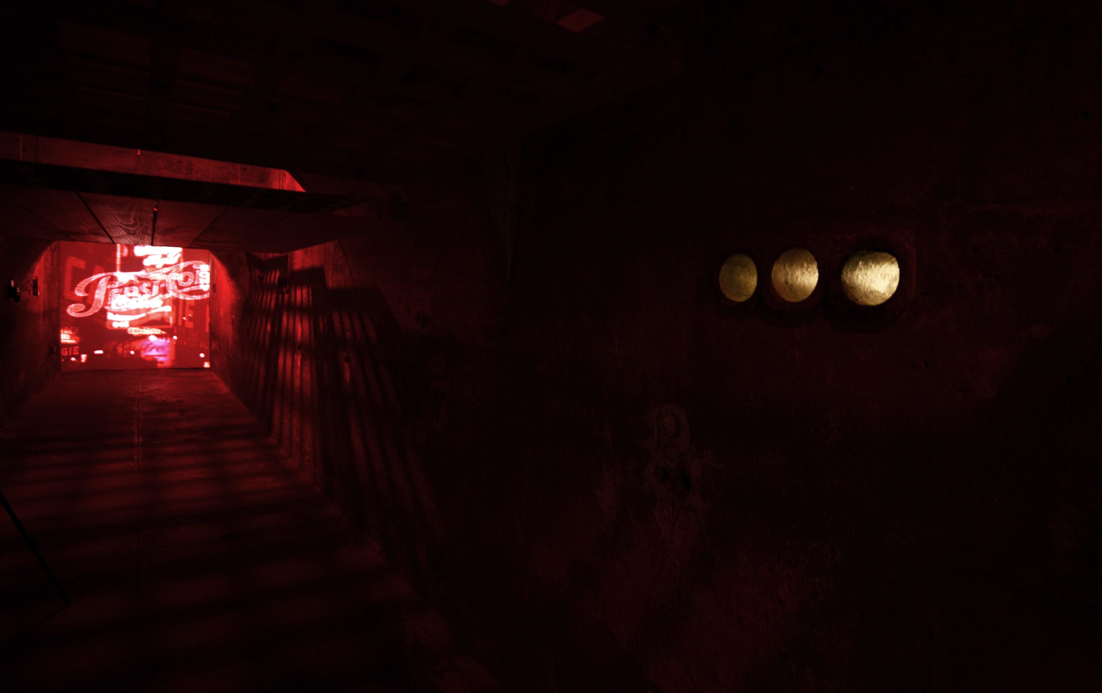 Priyanka Dasgupta & Chad Marshall's installation Passage considers the current plight of American immigration, by revisiting the paths that Blacks and early twentieth century Bengali sailors took to the United States, through the holds of slave ships and the boiler rooms of British Merchant vessels. "The New Colossus"—the sonnet by Emma Lazarus, engraved on the Statue of Liberty base as a welcoming address to immigrants—echoes through the installation: translated for the first time into Yoruba and Bengali, and set to traditional music by the artists' collaborators Moses Mabayoje and Monjula Datta. The sound is mixed to evoke the call and response tradition that is indigenous to both cultures, heard through the distinct forms of music belonging to each: the Yoruba drum story and Bengali boat songs, Bhatiyali. Passage, is indebted to the scholarship of Vivek Bald on the lost histories of Bengali sailors who passed as Black in the early twentieth century, settling into communities of color in the wake of anti-Asian immigration laws in the United States. Dasgupta and Marshall’s installation celebrates the spirit and culture that can emerge under conditions of forced displacement (what Frantz Fanon calls a “zone of non-being”), while critiquing the promise of the American dream. The lights of Times Square glow red at the end of the passage—the word “welcome” in Bengali and Yoruba obscuring at times, its signage.