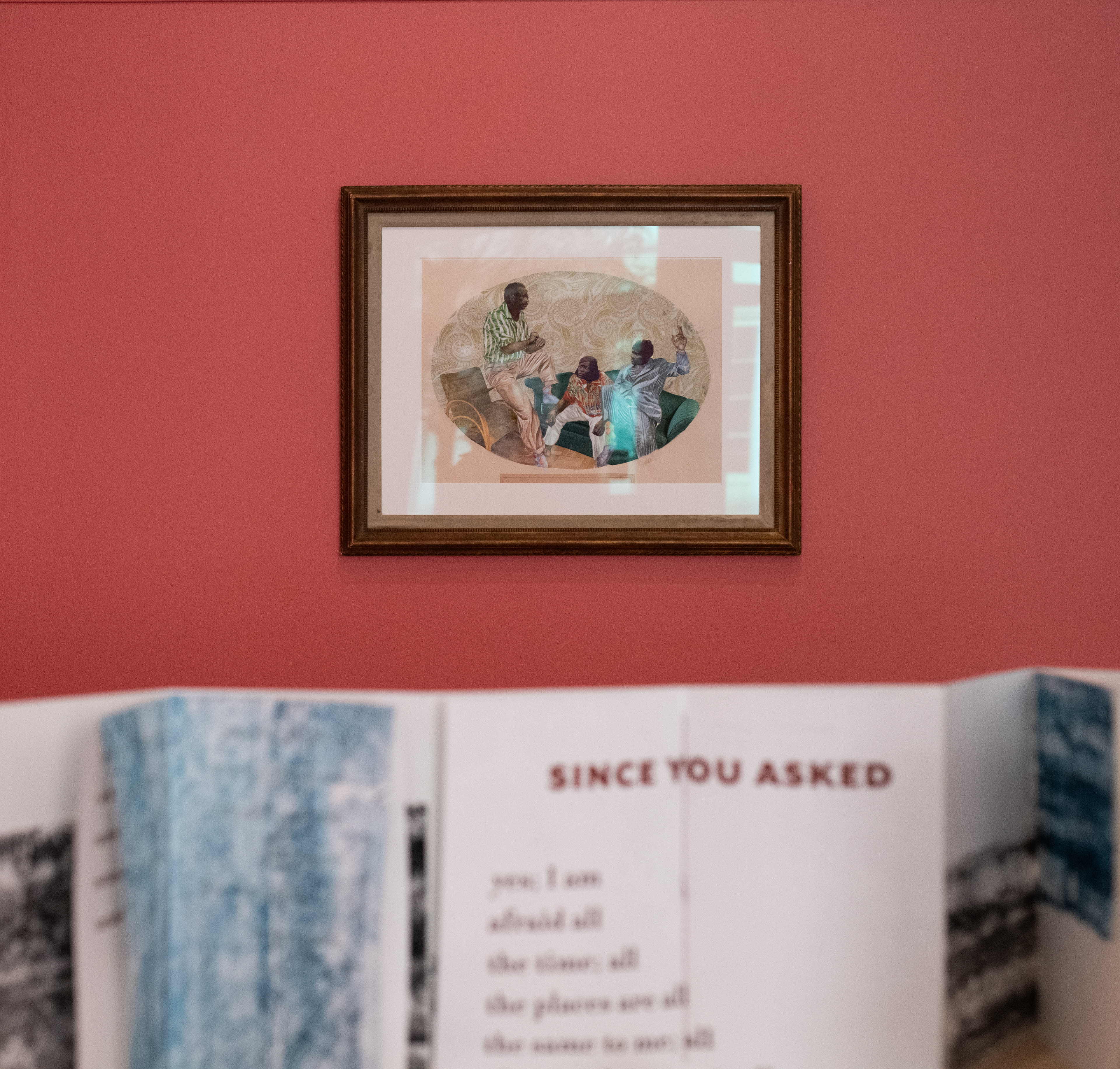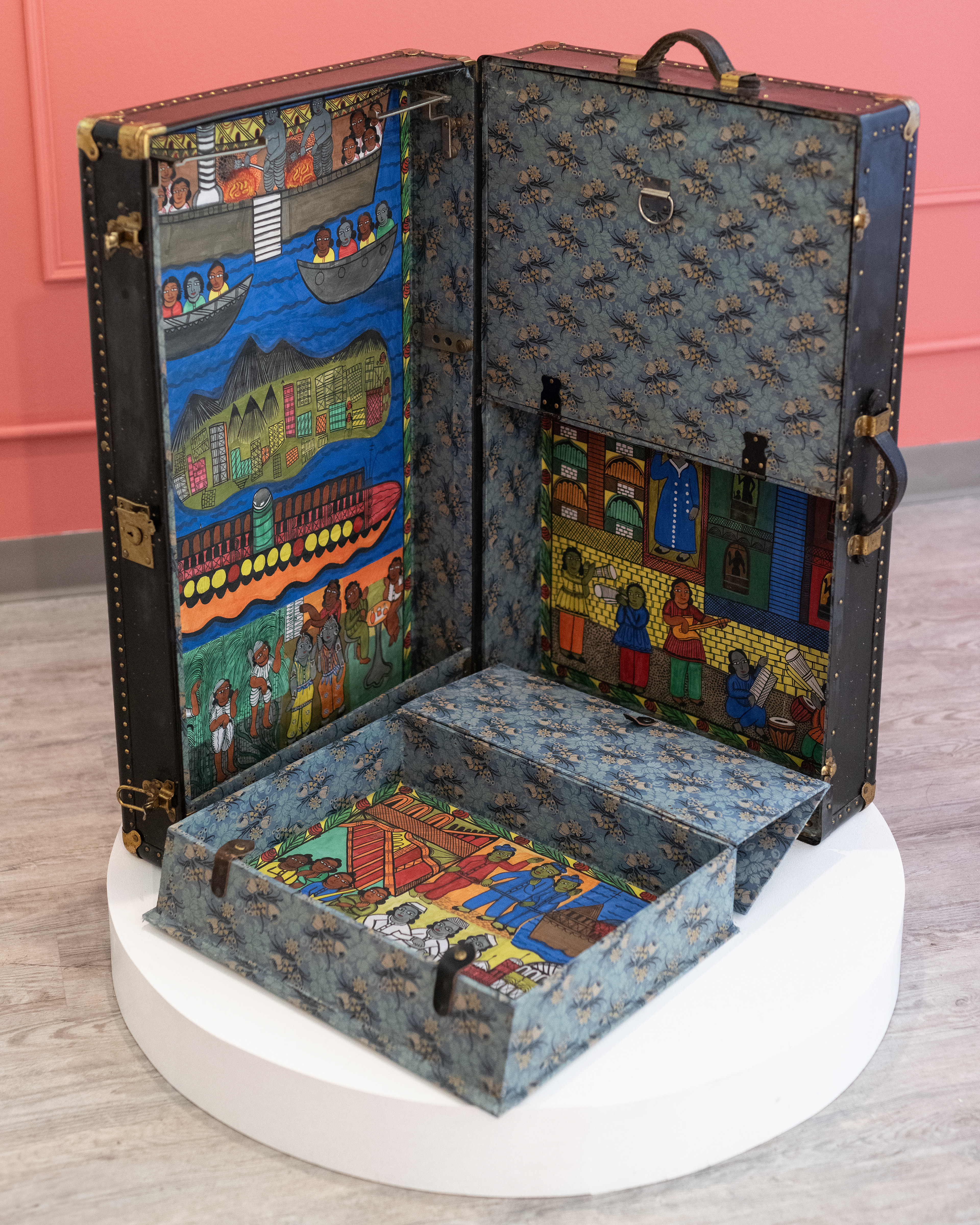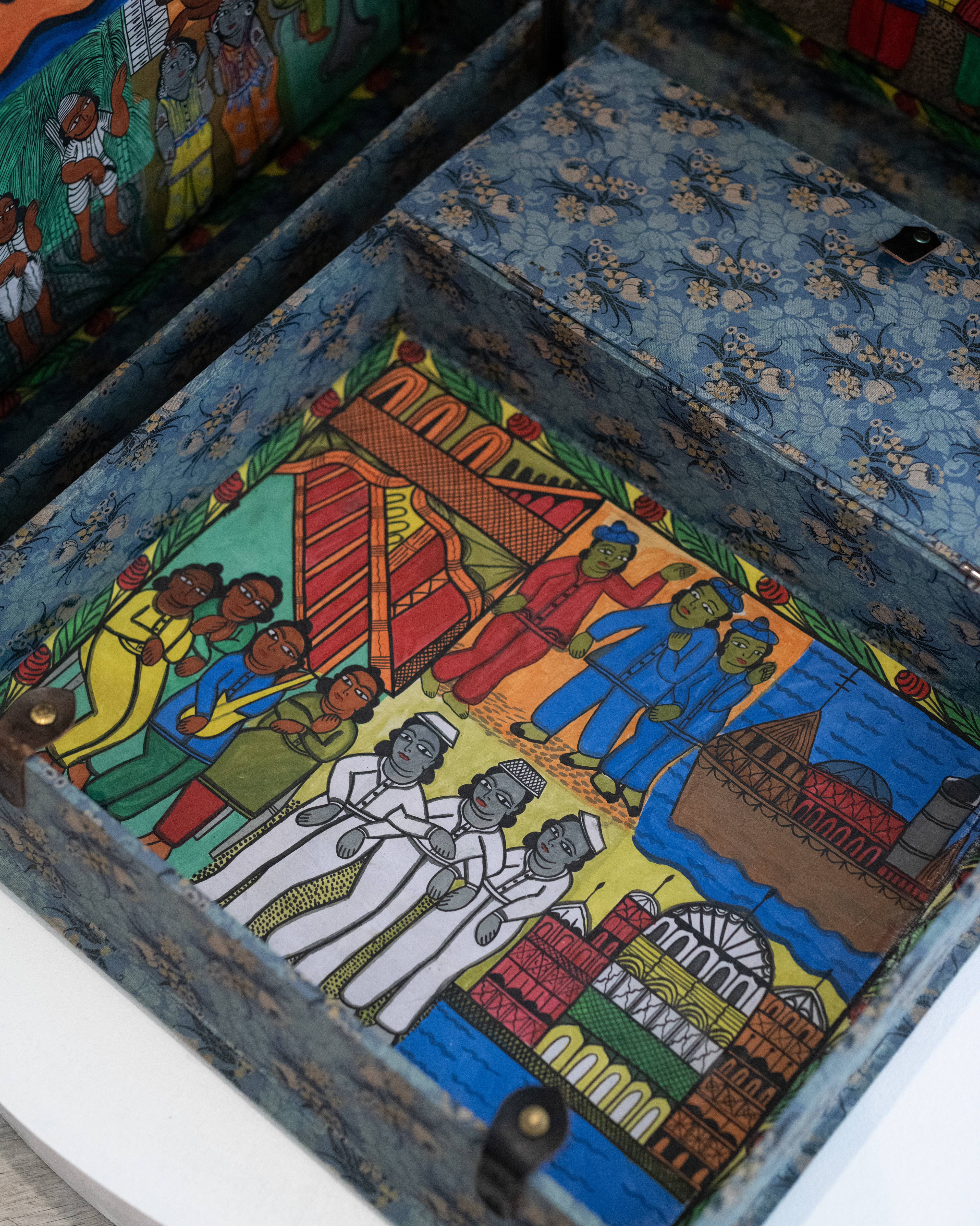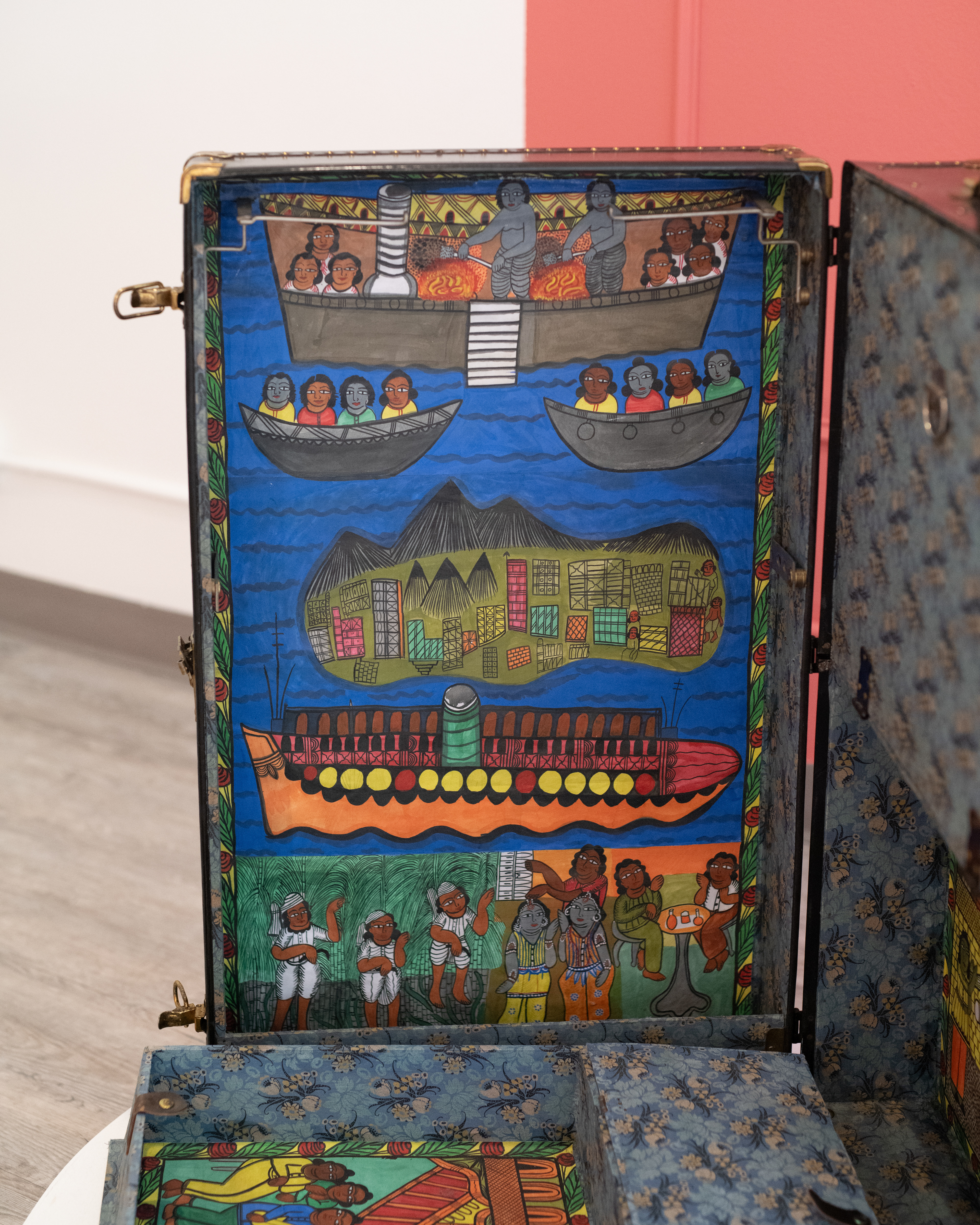 This group exhibition features works by Aaron Cohick and Divya Victor; Priyanka Dasgupta & Chad Marshall; Utsa Hazarika; and Baseera Khan. Imagined as a “continuum room,” the space of the gallery explores the shifting intersections of religion and race that have shaped South Asian lives in the United States. The featured projects connect multiple timelines in US history, often using objects and methods that speak of crossings or journeys. A trunk lined with hand-painted scrolls depicts the travels of a parafictional Bengali sailor, who migrates to the US in 1918 and lives as Black in Harlem, New York City. A book of poems unfurls like a tourist map, a type of document that instantly marks the person holding it as a foreigner. And a tiny postage stamp encapsulates a global history of solidarities—as well as unfulfilled promises—between South Asian and Black communities.