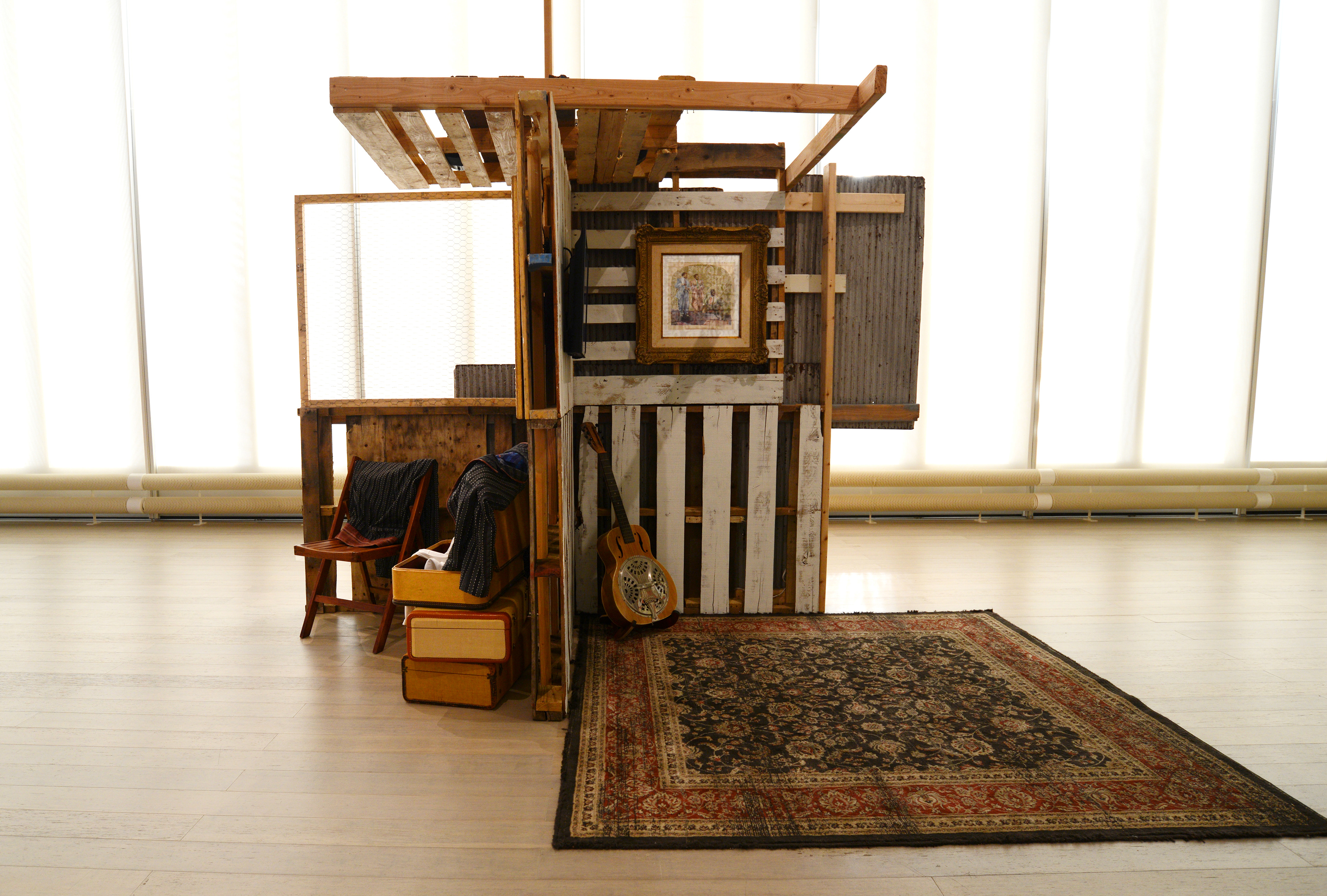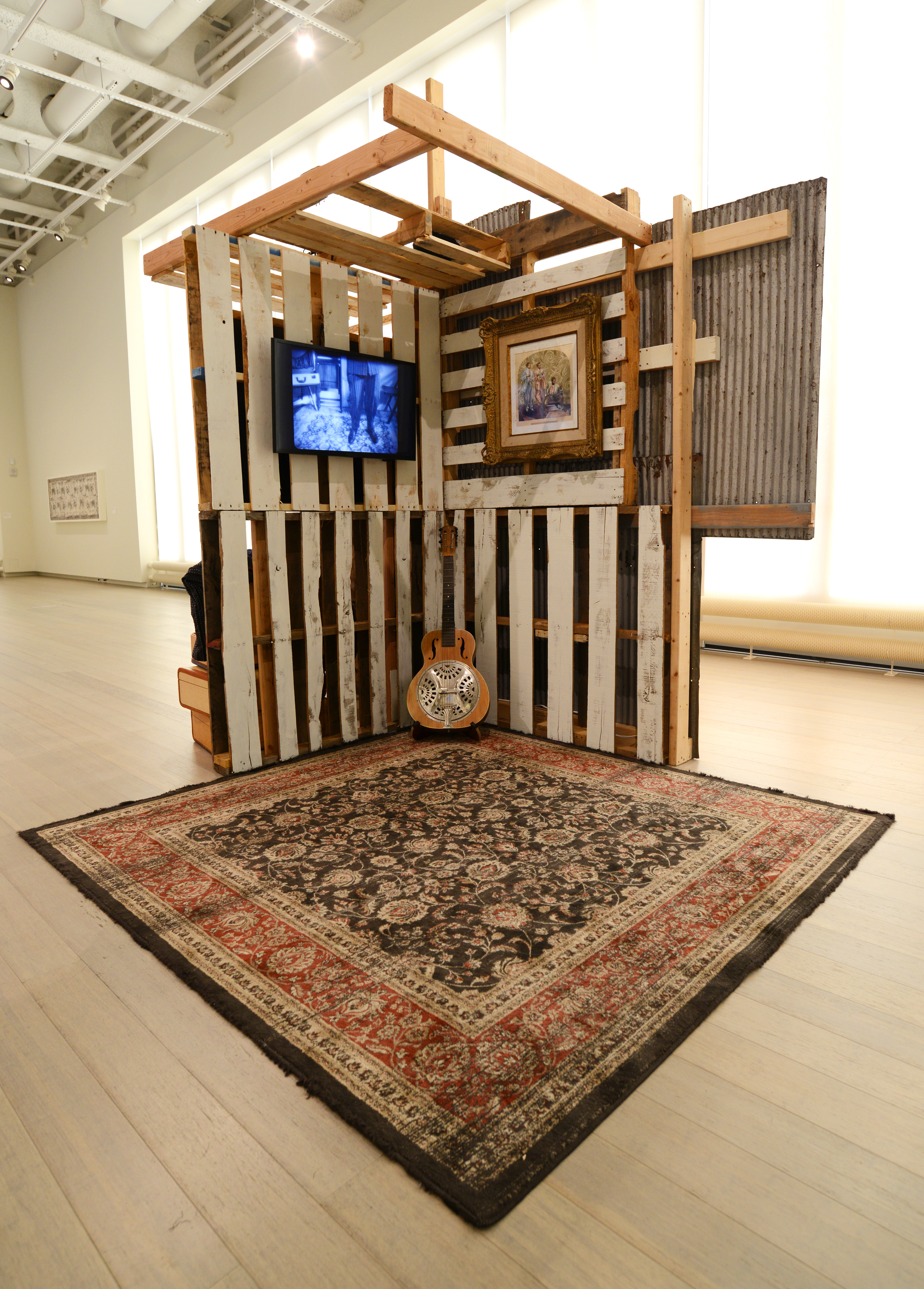 The artworks and installations are further shaped by each artist’s interest in the built environment: from the scale of a city neighborhood or the forested ghats of India, down to a concrete sidewalk in suburban USA or the privacy of an imagined interior space; and, from the cross-section of a monumental neoclassical column resurfaced in handmade rugs from Kashmir, down to the glitched surface of a latticed screen that recalls a jaali from the court of Mughal Emperor Akbar. The artists use these different scales and elements as conceptual—and at times physical—scaffolding for their inquiry into race and religion.