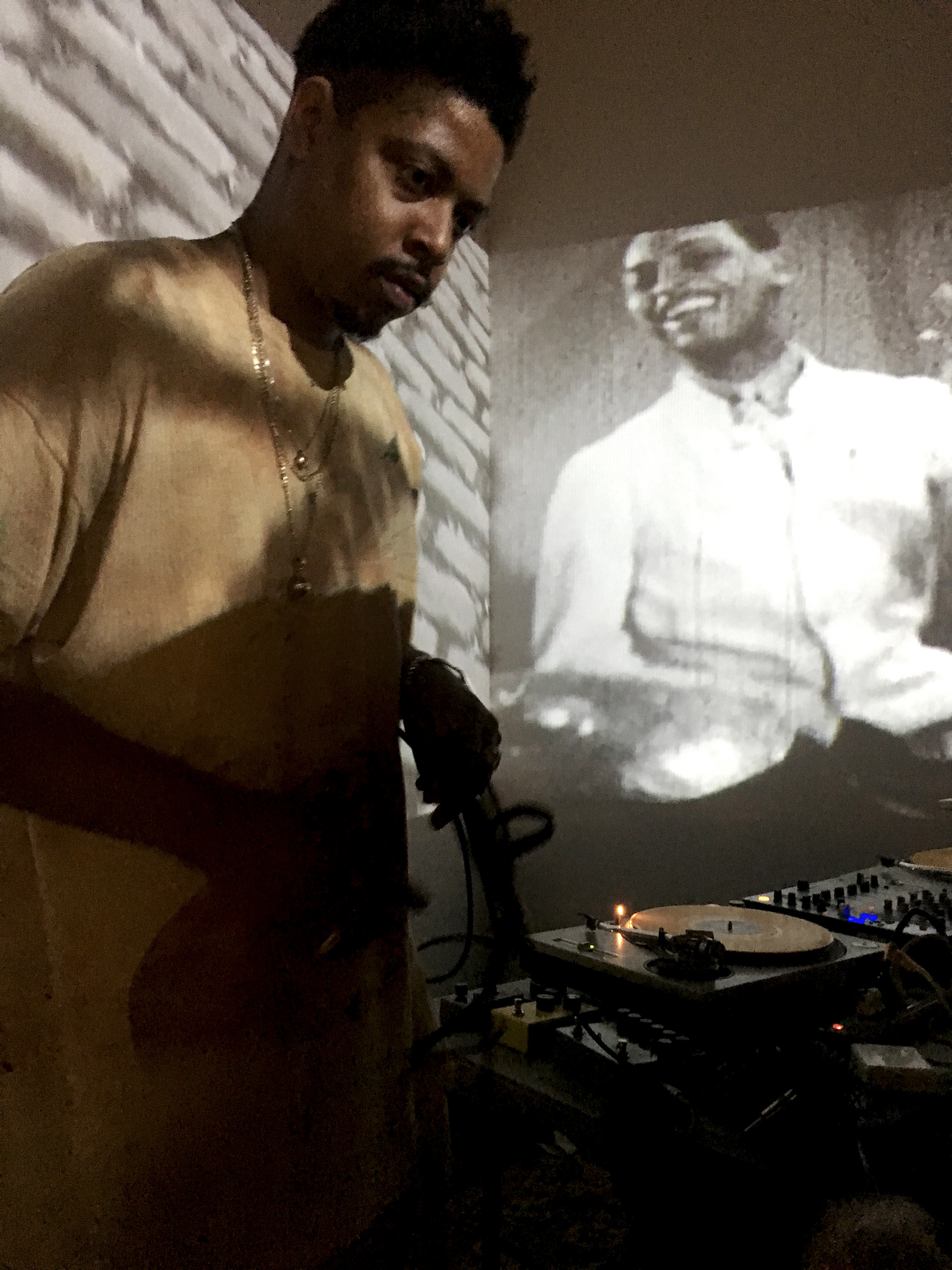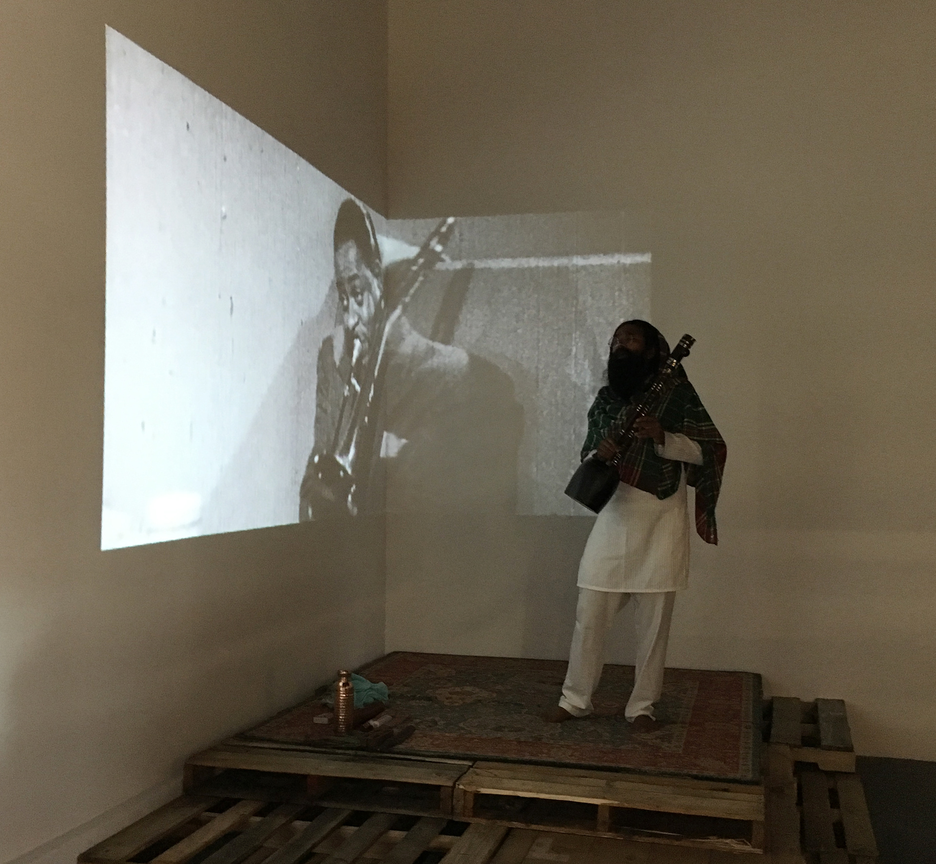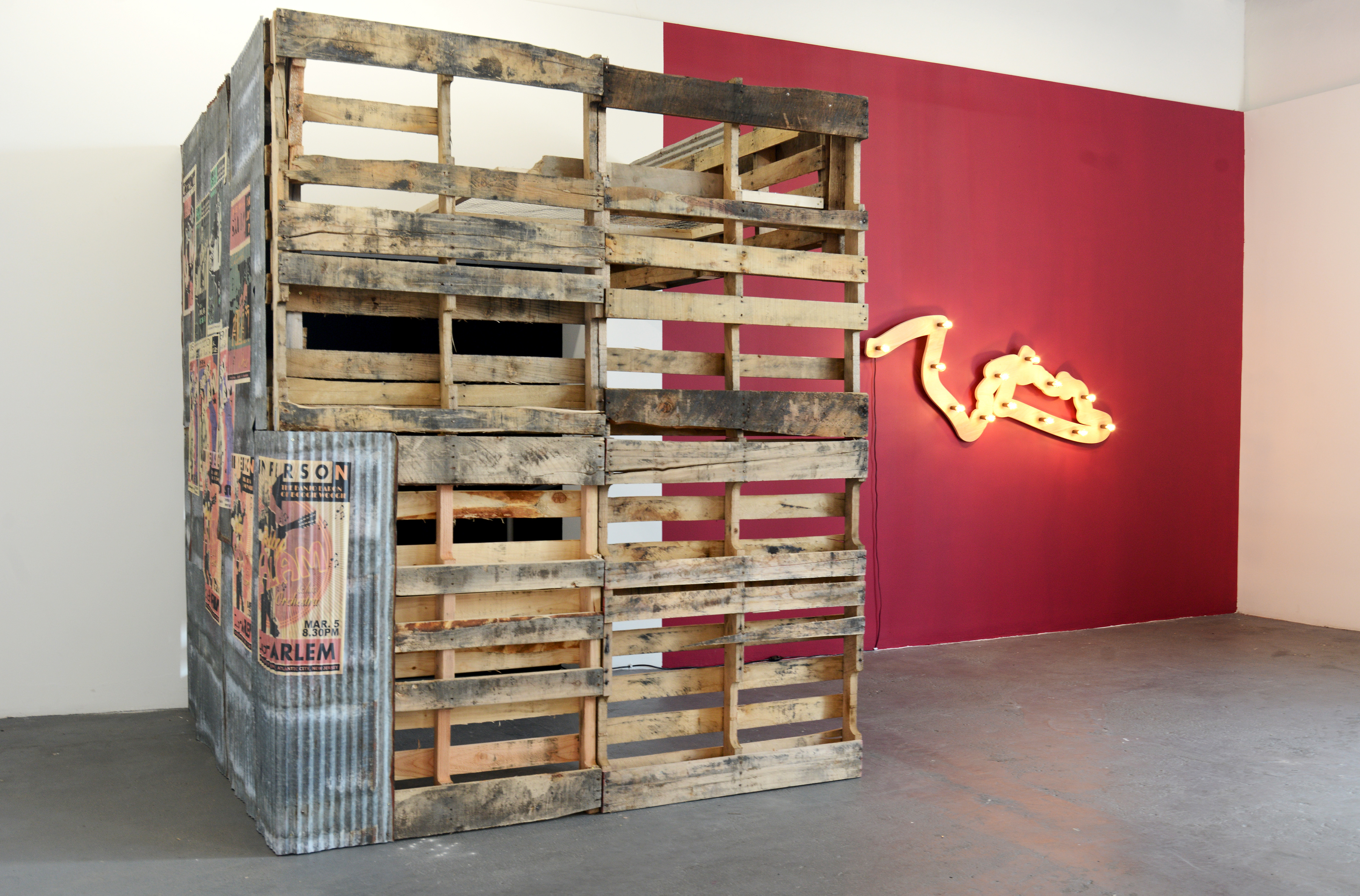 The installation portrays Alam’s dressing room, rehearsal space, and performance stage in the kind of backroads juke joint where he would have spent his evenings constructing and performing his adopted identity. The space is composed of wooden pallets and corrugated metal – materials reminiscent of early twentieth century juke joints that also echo Knockdown Center’s own architecture. Objects within the installation highlight Alam’s life and career as a musician: a zoot suit embellished with Indian kantha-style embroidery, old handbills and concert posters, musical com- positions, video documentation from Alam’s rehearsals, and private recordings. Clues within each of these objects reveal, upon close reading, the staged and dual nature of Alam’s identity, which subtly trespasses the lines between reality and fiction. As a whole, the installation draws parallels between the performative aspects of his life and career, and the invisible and visible forces that influence and define identity, illuminating the constructed nature of racial (and other identitarian) categories.